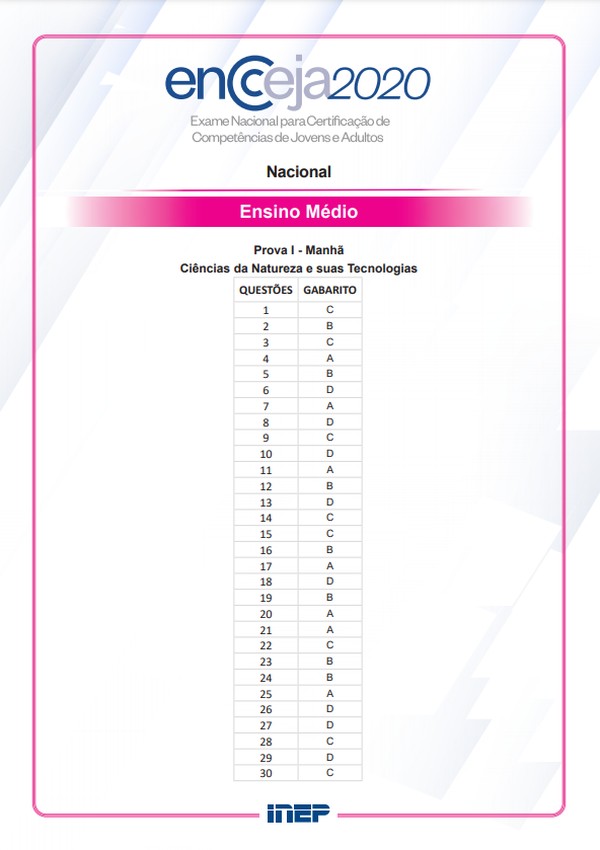 Para a certificação do ensino fundamental o participante foi avaliado em ciências naturais. 2019 - PPLReaplicação 2019 - Exterior PPL 2019 - Exterior 2019 2018 - PPLReaplicação 2018 2017 - PPLReaplicação 2017 2015 2014 2013. Para isso você precisa de acessar o site oficial do INEP e fazer o download do gabarito.